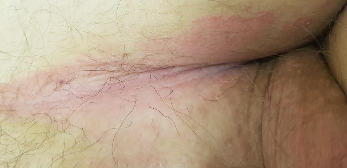 Симптомы псориаза могут поражать: внутреннюю поверхность бедер, ягодицы, область промежности и половые органы, анус.