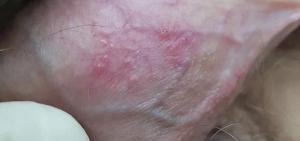На гениталиях возникают везикулезные, а затем эрозивно-язвенные элементы.