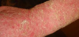 - II.Аллергические реакции, проявляющиеся на коже. Это контактный, аллергический или атопический дерматит, развивающийся при наличии сенсибилизации (повышенная чувствительность) организма человека к некоторым чужеродным соединениям. Это вещества в осноном белкового происхождения (аллергены). Данные заболевания дерматолог может диагностировать и лечить совместно с врачом аллергологом.